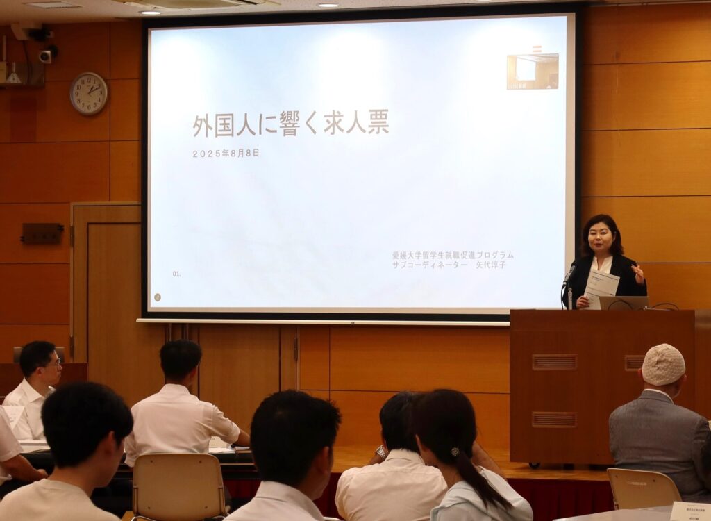 令和7年8月8日(金)、本学城北キャンパスにおいて、日本貿易振興機構愛媛貿易情報センター、四国経済連合会、本学国際連携推進機構留学生就職促進プログラム推進室の共催による、「~留学生と創る四国の未来~高度外国人材採用セミナー&留学生との交流会」を開催しました。本イベントは、四国地域の企業を対象にした高度外国人材の採用促進と四国の大学に在籍する留学生との交流を目的として企画されたものです。