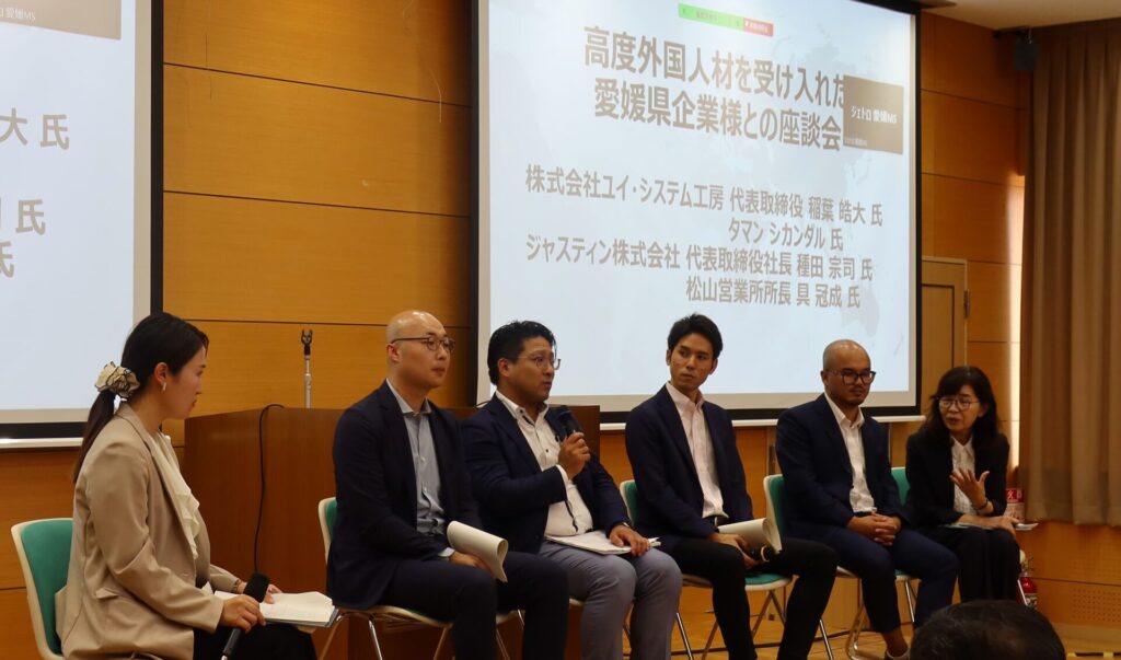 次に、愛媛県内で外国人を積極的に採用している事例として、株式会社ユイ・システム工房から稲葉皓大代表取締役およびタマン・シカンダル氏、ジャスティン株式会社から稲田宗司代表取締役社長および具冠成松山営業所長が登壇し、座談会を実施しました。具体的な採用事例や、採用後の職場におけるコミュニケーションの工夫、異文化共生を進めるうえでの成功のポイントが共有されました。