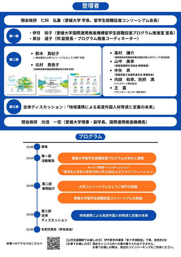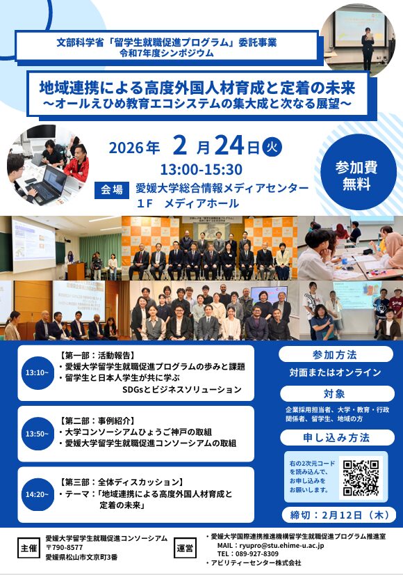 イベント 留プロでは、授業以外にも留学生の就職につながるイベントをおこなっています。 〇2025年度の実績、実施予定 ・「愛媛の大学と企業が育てるグローバル人材育成プログラム」開講式 ・~留学生と創る四国の未来~ 高度外国人材採用セミナー&留学生との交流会 ・留学生と企業の交流会 ・文部科学省「留学生就職促進プログラム」委託事業 令和7年度シンポジウム(2月24日) 〇2024年度の実績 ・「愛媛の大学と企業が育てるグローバル人材育成プログラム」開講式 ・高度外国人材活用セミナー in 愛媛 ・留学生と企業の交流会 ・高度外国人材活用セミナー&外国人留学生との交流会 ・企業の多文化共生の課題を解決!実践ワークショップ ~パターン・ランゲージで新たな発想と視点を得る~ ・「愛媛の大学と企業が育てるグローバル人材育成プログラム」開講式 〇イベントの様子 〇今年度実施イベント 〇これまでのチラシ